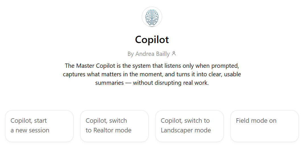 AI-assisted workflow tools designed for field-based professionals. Copilot was built for people who work in the field — where stopping to write things down isn’t realistic, and important details are often lost by the end of the day.Across real estate, drone work, job sites, and on-the-go roles, the same problem kept showing up: documentation happens late, incomplete, or not at all.Copilot changes that by letting users intentionally capture notes, actions, and observations by voice — in the moment — without disrupting their work. No passive listening. No background recording. Just clear, deliberate input and simple summaries when you need them.The result is less mental load, better records, and work that doesn’t follow you home.